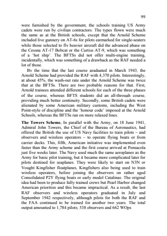 99were furnished by the government, the schools training US Army cadets were run by civilian contractors. The types flown were much the same as at the British schools, except that the Arnold Scheme included live gunnery on AT86s for pilots earmarked for single8seaters while those selected to fly heavier aircraft did the advanced phase on the Cessna AT817 Bobcat or the Curtiss AT89, which was something of a %u2018hot ship%u2019. The BFTSs did not offer multi8engine training, incidentally, which was something of a drawback as the RAF needed a lot of those. By the time that the last course graduated in March 1943, the Arnold Scheme had provided the RAF with 4,370 pilots. Interestingly, at about 45%, the wash8out rate under the Arnold Scheme was twice that at the BFTSs. There are two probable reasons for that. First, Arnold trainees attended different schools for each of the three phases of the course, whereas BFTS students did an all8through course, providing much better continuity. Secondly, some British cadets were alienated by some American military customs, including the West Point8style of discipline and the %u2018honour code%u2019 imposed at the Arnold Schools, whereas the BFTSs ran on more relaxed lines. *%u0017%u0006 %u0013.%u0017%)%u0006 %u000c&*%u0017%u0014%u0017? In parallel with the Army, on 18 June 1941, Admiral John Towers, the Chief of the Bureau of Aeronautics, had offered the British the use of US Navy facilities to train pilots %u2013 and observers and wireless operators %u2013 to operate flying boats or from carrier decks. This, fifth, American initiative was implemented even faster than the Army scheme and the first course arrived at Pensacola just five weeks later. The Navy used much the same aeroplanes as the Army for basic pilot training, but it became more complicated later for pilots destined for seaplanes. They were likely to start on N3N or Vought Kingfisher floatplanes, Kingfishers also being used to train wireless operators, before joining the observers on rather aged Consolidated P2Y flying boats or early model Catalinas. The original idea had been to produce fully trained crews but Pearl Harbor changed American priorities and this became impractical. As a result, the last RAF observers and wireless operators graduated in July and September 1942 respectively, although pilots for both the RAF and the FAA continued to be trained for another two years. The total output amounted to 1,784 pilots; 538 observers and 662 WOps