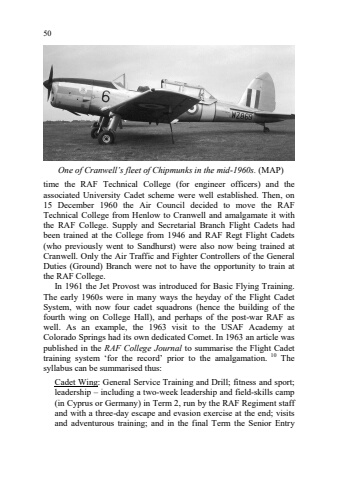 50time the RAF Technical College (for engineer officers) and the associated University Cadet scheme were well established. Then, on 15 December 1960 the Air Council decided to move the RAF Technical College from Henlow to Cranwell and amalgamate it with the RAF College. Supply and Secretarial Branch Flight Cadets had been trained at the College from 1946 and RAF Regt Flight Cadets (who previously went to Sandhurst) were also now being trained at Cranwell. Only the Air Traffic and Fighter Controllers of the General Duties (Ground) Branch were not to have the opportunity to train at the RAF College. In 1961 the Jet Provost was introduced for Basic Flying Training. The early 1960s were in many ways the heyday of the Flight Cadet System, with now four cadet squadrons (hence the building of the fourth wing on College Hall), and perhaps of the post-war RAF as well. As an example, the 1963 visit to the USAF Academy at Colorado Springs had its own dedicated Comet. In 1963 an article was published in the RAF College Journal to summarise the Flight Cadet training system %u2018for the record%u2019 prior to the amalgamation. 10 The syllabus can be summarised thus: Cadet Wing: General Service Training and Drill; fitness and sport; leadership %u2013 including a two-week leadership and field-skills camp (in Cyprus or Germany) in Term 2, run by the RAF Regiment staff and with a three-day escape and evasion exercise at the end; visits and adventurous training; and in the final Term the Senior Entry One of Cranwell%u2019s fleet of Chipmunks in the mid-1960s. (MAP)
