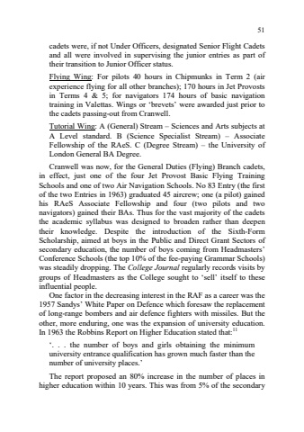 51cadets were, if not Under Officers, designated Senior Flight Cadets and all were involved in supervising the junior entries as part of their transition to Junior Officer status. Flying Wing: For pilots 40 hours in Chipmunks in Term 2 (air experience flying for all other branches); 170 hours in Jet Provosts in Terms 4 & 5; for navigators 174 hours of basic navigation training in Valettas. Wings or %u2018brevets%u2019 were awarded just prior to the cadets passing-out from Cranwell.Tutorial Wing: A (General) Stream %u2013 Sciences and Arts subjects at A Level standard. B (Science Specialist Stream) %u2013 Associate Fellowship of the RAeS. C (Degree Stream) %u2013 the University of London General BA Degree. Cranwell was now, for the General Duties (Flying) Branch cadets, in effect, just one of the four Jet Provost Basic Flying Training Schools and one of two Air Navigation Schools. No 83 Entry (the first of the two Entries in 1963) graduated 45 aircrew; one (a pilot) gained his RAeS Associate Fellowship and four (two pilots and two navigators) gained their BAs. Thus for the vast majority of the cadets the academic syllabus was designed to broaden rather than deepen their knowledge. Despite the introduction of the Sixth-Form Scholarship, aimed at boys in the Public and Direct Grant Sectors of secondary education, the number of boys coming from Headmasters%u2019 Conference Schools (the top 10% of the fee-paying Grammar Schools) was steadily dropping. The College Journal regularly records visits by groups of Headmasters as the College sought to %u2018sell%u2019 itself to these influential people. One factor in the decreasing interest in the RAF as a career was the 1957 Sandys%u2019 White Paper on Defence which foresaw the replacement of long-range bombers and air defence fighters with missiles. But the other, more enduring, one was the expansion of university education. In 1963 the Robbins Report on Higher Education stated that:11%u2018. . . the number of boys and girls obtaining the minimum university entrance qualification has grown much faster than the number of university places.%u2019 The report proposed an 80% increase in the number of places in higher education within 10 years. This was from 5% of the secondary
