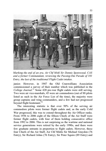 53junior. However, in 1947 the Old Cranwellians Association commissioned a survey of their number which was published in the College Journal.13 Some 420 pre-war flight cadets were still serving. Two were air vice-marshals, 45 were air commodores (out of 88 pilots listed as such in the Air Force List of the time), the majority were group captains and wing commanders, and a few had not progressed beyond flight lieutenant.14 The interesting statistic is that over 50% of the serving air commodore pilots were former flight cadets and, as the early Cold War progressed, this was to extend throughout the Air Officer ranks. From 1956 to 2006 eight of the fifteen Chiefs of the Air Staff were former flight cadets, with four of them holding consecutive office from 1992 to 2006. This is not surprising as the wartime and national service generations were retired by the early 1990s, and there were few graduate entrants in proportion to flight cadets. However, these four Chiefs of the Air Staff, Air Chf Mshls Sir Michael Graydon (76 Entry), Sir Richard Johns (76 Entry), Sir Peter Squire (89 Entry) and Marking the end of an era, Air Chf Mshl Sir Dennis Spotswood, CAS and a former Commandant, reviewing the Passing-Out Parade of 101 Entry, the last of the traditional Flight Cadet intakes.