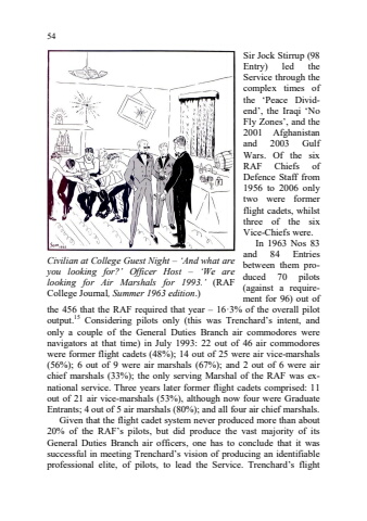 54Sir Jock Stirrup (98 Entry) led the Service through the complex times of the %u2018Peace Dividend%u2019, the Iraqi %u2018No Fly Zones%u2019, and the 2001 Afghanistan and 2003 Gulf Wars. Of the six RAF Chiefs of Defence Staff from 1956 to 2006 only two were former flight cadets, whilst three of the six Vice-Chiefs were. In 1963 Nos 83 and 84 Entries between them produced 70 pilots (against a requirement for 96) out of the 456 that the RAF required that year %u2013 16%u00b73% of the overall pilot output.15 Considering pilots only (this was Trenchard%u2019s intent, and only a couple of the General Duties Branch air commodores were navigators at that time) in July 1993: 22 out of 46 air commodores were former flight cadets (48%); 14 out of 25 were air vice-marshals (56%); 6 out of 9 were air marshals (67%); and 2 out of 6 were air chief marshals (33%); the only serving Marshal of the RAF was exnational service. Three years later former flight cadets comprised: 11 out of 21 air vice-marshals (53%), although now four were Graduate Entrants; 4 out of 5 air marshals (80%); and all four air chief marshals. Given that the flight cadet system never produced more than about 20% of the RAF%u2019s pilots, but did produce the vast majority of its General Duties Branch air officers, one has to conclude that it was successful in meeting Trenchard%u2019s vision of producing an identifiable professional elite, of pilots, to lead the Service. Trenchard%u2019s flight Civilian at College Guest Night %u2013 %u2018And what are you looking for?%u2019 Officer Host %u2013 %u2018We are looking for Air Marshals for 1993.%u2019 (RAF College Journal, Summer 1963 edition.)