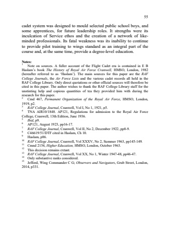 55cadet system was designed to mould selected public school boys, and some apprentices, for future leadership roles. It strengths were its inculcation of Service ethos and the creation of a network of likeminded professionals. Its fatal weakness was its inability to continue to provide pilot training to wings standard as an integral part of the course and, at the same time, provide a degree-level education. Notes: 1 Note on sources. A fuller account of the Flight Cadet era is contained in E B Haslam%u2019s book The History of Royal Air Force Cranwell, HMSO, London, 1982 (hereafter referred to as %u2018Haslam%u2019). The main sources for this paper are the RAF College Journals, the Air Force Lists and the various cadet records all held in the RAF College Library. Only direct quotations or other official sources will therefore be cited in this paper. The author wishes to thank the RAF College Library staff for the unstinting help and copious quantities of tea they provided him with during the research for this paper. 2 Cmd 467, Permanent Organization of the Royal Air Force, HMSO, London, 1919, p2. 3 RAF College Journal, Cranwell, Vol I, No 1, 1921, p5. 4 TNA AIR10/1848. AP121, Regulations for admission to the Royal Air Force College, Cranwell, 13th Edition, June 1936. 5 Ibid, p9. 6 AP121, August 1923, pp16-17. 7 RAF College Journal, Cranwell, Vol II, No 2, December 1922, pp8-9. 8 C46619/51/DTF cited in Haslam, Ch 10. 9 Haslam, p86. 10 RAF College Journal, Cranwell, Vol XXXV, No 2, Summer 1963, pp145-149. 11 Cmnd 2154, Higher Education, HMSO, London, October 1963. 12 This decision remains extant. 13 RAF College Journal, Cranwell, Vol XX, No 1, Winter 1947-48, pp46-47. 14 Only substantive ranks considered. 15 Jefford, Wing Commander C G; Observers and Navigators, Grub Street, London, 2014, p331.