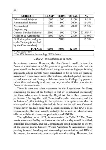 44the entrance exams. However, the Air Council could %u2018where the financial circumstances of the parents or guardians are such that the grant would not be justified%u2019 award the grant to other high-performing applicants whose parents were considered to be in need of financial assistance.5 There were some other external scholarships but one cadet record shows a cadet being withdrawn from the College %u2018by parents%u2019 rather than voluntarily and one can only wonder if that was due to financial circumstances. There is also one clear statement in the Regulations for Entry concerning the role of the College in that it %u2018 is intended exclusively for those who desire to make the Royal Air Force their permanent profession.%u2019 Put together with Trenchard%u2019s earlier statements, and the inclusion of pilot training in the syllabus, it is quite clear that he envisaged an exclusively pilot-led air force. As we will see, Cranwell would never produce more than a small minority of the RAF%u2019s pilot requirements; the rest would, initially, be a mix of short-service officers with limited career opportunities and SNCOs. The syllabus, as at 1923, is summarised in Table 2.6 The Term marks were awarded by the instructors in, what today would be called, continual assessment, and the Commandant could award up to 16%u00b75% of the overall marks himself. Within %u2018Aviation & Aeronautics%u2019 pure piloting (aircraft handling and airmanship) amounted to just 10% of the course; the remainder was navigation and spotting. However, the SUBJECT EXAM* TERM TOTAL % Educational Subjects 600 500 1100 9%u00b71% Aeronautical Science 1200 800 2000 16%u00b75% Aeronautical Engineering 1300 700 2000 16%u00b75% General Service Subjects 2100 600 2700 22%u00b73%** Aviation & Aeronautics 1100 1200 2300 19%u00b70% Drill, discipline and general efficiency (awarded by the Commandant) 2000 16%u00b75% TOTALS 6300 5800 12100 * Pass mark = 55%** Inc 12% Armament, Meteorology, W/T & MorseTable 2. The Syllabus as at 1923.