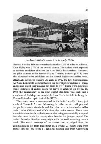45General Service Subjects contained a further 12% of aviation subjects. Thus flying was 31% of the overall course. The cadets were expected to become proficient pilots on the Avro 504, a basic trainer. However, the pilot trainees at the Service Flying Training Schools (SFTS) were also expected to be proficient on the Bristol Fighter or similar types, effectively advanced trainers. As early as 1922 the first Commandant, Air Cdre Longcroft, commented on the poor flying standards of many cadets and stated that %u2018anyone can learn to fly%u2019.7 There were, however, many instances of cadets giving up leave to catch-up on flying. By 1936 the discrepancy in the pilot output standards was such that a squadron of Bulldogs was established on North Airfield to bring the Cranwell standard up to that of the SFTSs. The cadets were accommodated in the hutted ex-RN Lines, just south of Cranwell Avenue. Mirroring the other service colleges, and the public schools, standards and discipline were set and enforced by cadet Under Officers and NCOs from the senior course. There were some initiation rituals with the new cadet being ceremonially accepted into the cadet body by having their bowler hat jumped upon! The cadets formally dined-in every night with the staff attending once a week. The social make-up of the course can be judged from the commissioning list from December 1932 where: 23 cadets were from public schools; one from a Technical School; one from Cambridge An Avro 504K at Cranwell in the early 1920s.