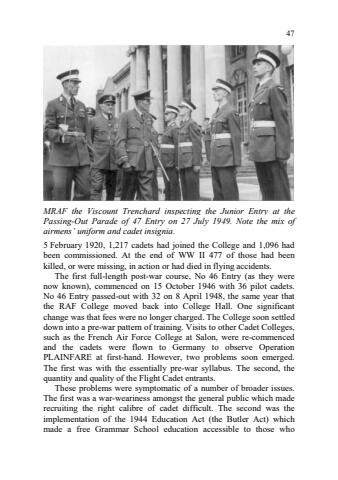 475 February 1920, 1,217 cadets had joined the College and 1,096 had been commissioned. At the end of WW II 477 of those had been killed, or were missing, in action or had died in flying accidents. The first full-length post-war course, No 46 Entry (as they were now known), commenced on 15 October 1946 with 36 pilot cadets. No 46 Entry passed-out with 32 on 8 April 1948, the same year that the RAF College moved back into College Hall. One significant change was that fees were no longer charged. The College soon settled down into a pre-war pattern of training. Visits to other Cadet Colleges, such as the French Air Force College at Salon, were re-commenced and the cadets were flown to Germany to observe Operation PLAINFARE at first-hand. However, two problems soon emerged. The first was with the essentially pre-war syllabus. The second, the quantity and quality of the Flight Cadet entrants. These problems were symptomatic of a number of broader issues. The first was a war-weariness amongst the general public which made recruiting the right calibre of cadet difficult. The second was the implementation of the 1944 Education Act (the Butler Act) which made a free Grammar School education accessible to those who MRAF the Viscount Trenchard inspecting the Junior Entry at the Passing-Out Parade of 47 Entry on 27 July 1949. Note the mix of airmens%u2019 uniform and cadet insignia.