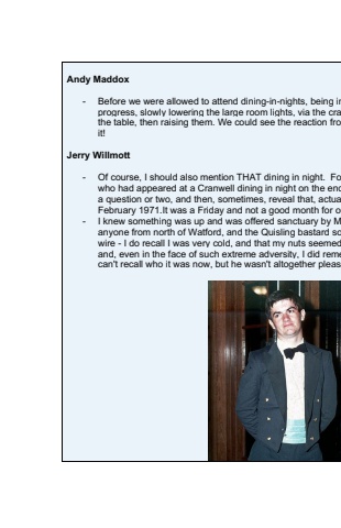 Andy Maddox- Before we were allowed to attend dining-in-nights, being inprogress, slowly lowering the large room lights, via the crathe table, then raising them. We could see the reaction froit!Jerry Willmott- Of course, I should also mention THAT dining in night. Fowho had appeared at a Cranwell dining in night on the enda question or two, and then, sometimes, reveal that, actuaFebruary 1971.It was a Friday and not a good month for ou- I knew something was up and was offered sanctuary by Manyone from north of Watford, and the Quisling bastard sowire - I do recall I was very cold, and that my nuts seemedand, even in the face of such extreme adversity, I did remecan't recall who it was now, but he wasn't altogether please