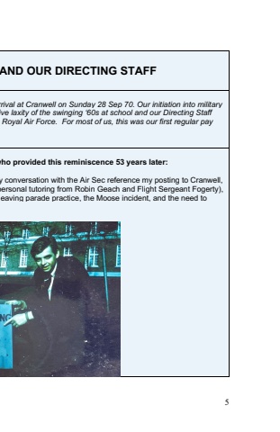 5AND OUR DIRECTING STAFFrrival at Cranwell on Sunday 28 Sep 70. Our initiation into military ive laxity of the swinging %u201860s at school and our Directing Staff Royal Air Force. For most of us, this was our first regular pay who provided this reminiscence 53 years later:y conversation with the Air Sec reference my posting to Cranwell, personal tutoring from Robin Geach and Flight Sergeant Fogerty), eaving parade practice, the Moose incident, and the need to