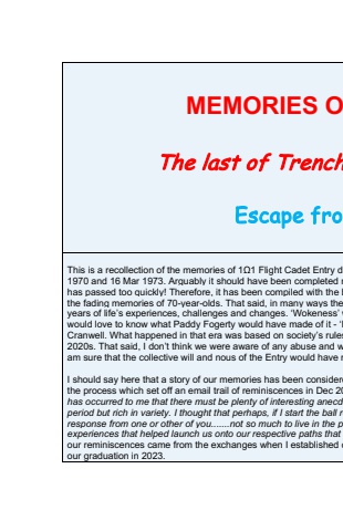 MEMORIES OThe last of TrenchEscape froThis is a recollection of the memories of 1%u03a91 Flight Cadet Entry d1970 and 16 Mar 1973. Arguably it should have been completed mhas passed too quickly! Therefore, it has been compiled with the bthe fading memories of 70-year-olds. That said, in many ways theyears of life%u2019s experiences, challenges and changes. %u2018Wokeness%u2019 wwould love to know what Paddy Fogerty would have made of it - %u2018FCranwell. What happened in that era was based on society%u2019s rules2020s. That said, I don%u2019t think we were aware of any abuse and wam sure that the collective will and nous of the Entry would have rI should say here that a story of our memories has been considerethe process which set off an email trail of reminiscences in Dec 20has occurred to me that there must be plenty of interesting anecdoperiod but rich in variety. I thought that perhaps, if I start the ball roresponse from one or other of you.......not so much to live in the pexperiences that helped launch us onto our respective paths that our reminiscences came from the exchanges when I established oour graduation in 2023.