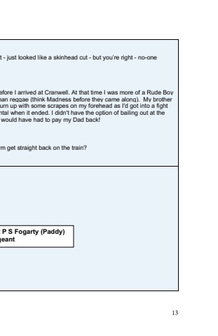 13t - just looked like a skinhead cut - but you%u2019re right - no-one efore I arrived at Cranwell. At that time I was more of a Rude Boy han reggae (think Madness before they came along). My brother urn up with some scrapes on my forehead as I'd got into a fight ntal when it ended. I didn't have the option of bailing out at the would have had to pay my Dad back!rm get straight back on the train? P S Fogarty (Paddy)geant