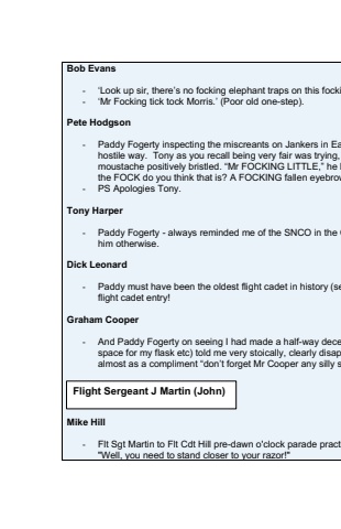 Bob Evans- %u2018Look up sir, there%u2019s no focking elephant traps on this focki- %u2018Mr Focking tick tock Morris.%u2019 (Poor old one-step).Pete Hodgson - Paddy Fogerty inspecting the miscreants on Jankers in Eahostile way. Tony as you recall being very fair was trying, moustache positively bristled. %u201cMr FOCKING LITTLE,%u201d he bthe FOCK do you think that is? A FOCKING fallen eyebrow- PS Apologies Tony.Tony Harper- Paddy Fogerty - always reminded me of the SNCO in the Chim otherwise.Dick Leonard- Paddy must have been the oldest flight cadet in history (seflight cadet entry!Graham Cooper- And Paddy Fogerty on seeing I had made a half-way decespace for my flask etc) told me very stoically, clearly disapalmost as a compliment %u201cdon%u2019t forget Mr Cooper any silly sMike Hill- Flt Sgt Martin to Flt Cdt Hill pre-dawn o'clock parade practi\, you need to stand closer to your razor!\Flight Sergeant J Martin (John)