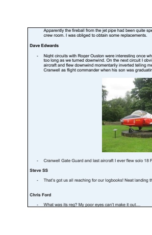 Apparently the fireball from the jet pipe had been quite specrew room. I was obliged to obtain some replacements.Dave Edwards- Night circuits with Roger Ouston were interesting once whtoo long as we turned downwind. On the next circuit I obvioaircraft and flew downwind momentarily inverted telling meCranwell as flight commander when his son was graduatin- Cranwell Gate Guard and last aircraft I ever flew solo 18 FSteve SS- That%u2019s got us all reaching for our logbooks! Neat landing thChris Ford- What was its reg? My poor eyes can%u2019t make it out....