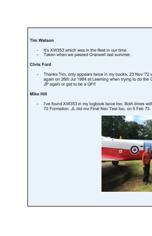 Tim Watson- It%u2019s XW353 which was in the fleet in our time.- Taken when we passed Cranwell last summer.Chris Ford- Thanks Tim, only appears twice in my books, 23 Nov '72 wagain on 26th Jul 1984 at Leeming when trying to do the CJP again or get to be a QFI!Mike Hill- I%u2019ve found XW353 in my logbook twice too. Both times with72 Formation. JL did my Final Nav Test too, on 5 Feb 73. O