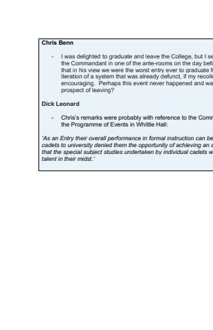 Chris Benn- I was delighted to graduate and leave the College, but I sethe Commandant in one of the ante-rooms on the day befothat in his view we were the worst entry ever to graduate friteration of a system that was already defunct, if my recolleencouraging. Perhaps this event never happened and wasprospect of leaving?Dick Leonard- Chris%u2019s remarks were probably with reference to the Commthe Programme of Events in Whittle Hall:%u2018As an Entry their overall performance in formal instruction can becadets to university denied them the opportunity of achieving an athat the special subject studies undertaken by individual cadets wtalent in their midst.%u2019