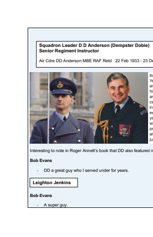 Interesting to note in Roger Annett%u2019s book that DD also featured inBob Evans- DD a great guy who I served under for years. Bob Evans- A super guy.Squadron Leader D D Anderson (Dempster Dobie)Senior Regiment InstructorAir Cdre DD Anderson MBE RAF Retd 22 Feb 1933 - 23 DeLeighton Jenkins