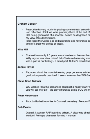 Graham Cooper- Peter, thanks very much for putting some context around o- on reflection I think we were probably there at the end of Hall being given a bit of a shoosh - before he disgraced himmy view of his likely future. - I still recall the College as all but pristine and reverence betime of it than we %u2018softies of today%u2019.Mike Hill- Cranwell was only 2.5 years in our late teens. I remember Willy in your rear view mirror! I don%u2019t rule out returning evewas a part of our history - a small part. But let%u2019s recall it witJonnie Taylor- Re japes, didn't the mountaineering guys get some articlesgraduation parade practice? I seem to remember WO GarSteve Scott Skinner- WO Garbett (aka the screaming skull) not a happy man? Wyou will call me %u2018Sir%u2019 - the only difference being YOU will mPeter Herbertson- Poor Jo Garbett now lies in Cranwell cemetery. Tempus FBob Evans- Overall, it was an RAF boarding school. A slow way of traiwisdom! Perhaps character forming %u2013 maybe.