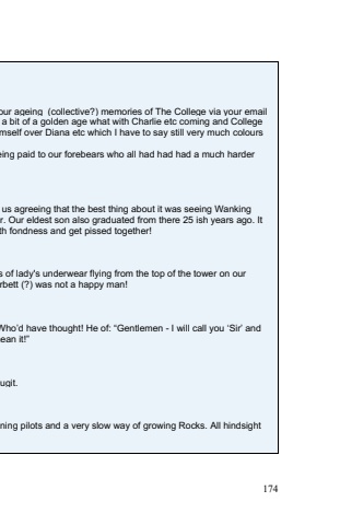 174our ageing (collective?) memories of The College via your email a bit of a golden age what with Charlie etc coming and College mself over Diana etc which I have to say still very much colours eing paid to our forebears who all had had had a much harder us agreeing that the best thing about it was seeing Wanking r. Our eldest son also graduated from there 25 ish years ago. It th fondness and get pissed together!s of lady's underwear flying from the top of the tower on our rbett (?) was not a happy man!Who%u2019d have thought! He of: %u201cGentlemen - I will call you %u2018Sir%u2019 and ean it!%u201dugit.ning pilots and a very slow way of growing Rocks. All hindsight