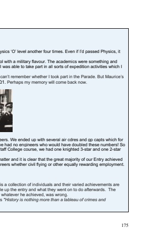 175ysics %u2018O%u2019 level another four times. Even if I%u2019d passed Physics, it ol with a military flavour. The academics were something and I was able to take part in all sorts of expedition activities which I can%u2019t remember whether I took part in the Parade. But Maurice%u2019s %u03a91. Perhaps my memory will come back now.eers. We ended up with several air cdres and gp capts which for we had no engineers who would have doubled these numbers! So taff College course, we had one knighted 3-star and one 2-star matter and it is clear that the great majority of our Entry achieved reers whether civil flying or other equally rewarding employment.is a collection of individuals and their varied achievements are de up the entry and what they went on to do afterwards. The whatever he achieved, was wrong.s \