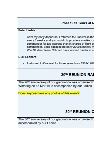 Post 1973 Tours at RPeter Herbie- After my early departure, I returned to Cranwell in theevery 6 weeks and you could chop cadets - unlike todcommander for two courses then in charge of flight cocommander. Back again in the early 2000's initially flyWar Studies Team. \Dick Leonard- I returned to Cranwell for three years from 1981-198420th REUNION RAFThe 20th anniversary of our graduation was organised bWittering on 13 Mar 1993 accompanied by our Ladies.Does anyone have any photos of this event?30th REUNION CThe 30th anniversary of our graduation was organised baccompanied by our Ladies.