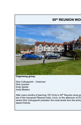 50th REUNION WOOOrganising group:Dick Cullingworth %u2013 ChairmanDick LeonardAndy SpinksAndy MaddoxAfter many months of planning 1%u03a91 Entry%u2019s 50th Reunion since grbar of the renowned Petwood hotel, Lincs, on the afternoon of 23 where Dick Cullingworth presided, the noise levels from the animaabsent friends.