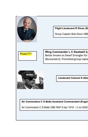 Flight Lieutenant R Dixon (BoGroup Captain Bob Dixon OBELieutenant Colonel D AllenAir Commodore C S Betts Assistant Commandant (EngineAir Commodore C S Betts CBE RAF 8 Apr 1919 %u2013 3 Jul 2002 Wing Commander L C Swalwell (LBetter known as Dwarf Strangler for (Buccaneers). Promoted group captaPhoto???