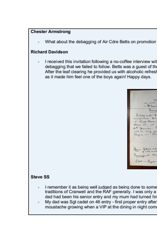Chester Armstrong- What about the debagging of Air Cdre Betts on promotion Richard Davidson- I received this invitation following a no-coffee interview withdebagging that we failed to follow. Betts was a guest of theAfter the leaf clearing he provided us with alcoholic refreshas it made him feel one of the boys again! Happy days.Steve SS- I remember it as being well judged as being done to someotraditions of Cranwell and the RAF generally. I was only a dad had been his senior entry and my mum had turned him- My dad was Sgt cadet on 46 entry - first proper entry after moustache growing when a VIP at the dining in night comm