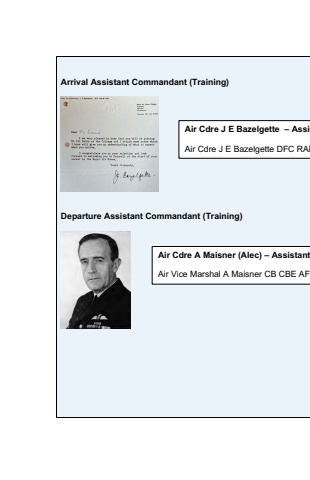 Arrival Assistant Commandant (Training)Departure Assistant Commandant (Training)Air Cdre A Maisner (Alec) %u2013 AssistantAir Vice Marshal A Maisner CB CBE AFCAir Cdre J E Bazelgette %u2013 AssisAir Cdre J E Bazelgette DFC RAF