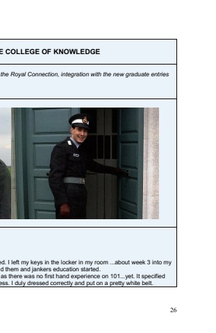 26E COLLEGE OF KNOWLEDGE the Royal Connection, integration with the new graduate entries ed. I left my keys in the locker in my room ...about week 3 into my d them and jankers education started. as there was no first hand experience on 101...yet. It specified ess. I duly dressed correctly and put on a pretty white belt.