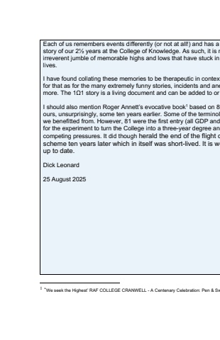 Each of us remembers events differently (or not at all!) and has a story of our 2%u00bd years at the College of Knowledge. As such, it is nirreverent jumble of memorable highs and lows that have stuck in lives.I have found collating these memories to be therapeutic in contextfor that as for the many extremely funny stories, incidents and anemore. The 1%u03a91 story is a living document and can be added to or I should also mention Roger Annett%u2019s evocative book1 based on 8ours, unsurprisingly, some ten years earlier. Some of the terminolwe benefitted from. However, 81 were the first entry (all GDP and for the experiment to turn the College into a three-year degree andcompeting pressures. It did though herald the end of the flight cscheme ten years later which in itself was short-lived. It is weup to date.Dick Leonard25 August 20251 %u2018We seek the Highest%u2019 RAF COLLEGE CRANWELL - A Centenary Celebration: Pen & Sw