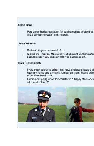 Chris Benn- Paul Luker had a reputation for getting cadets to stand at tlike a gorilla%u2019s foreskin%u201d until hoarse.Jerry Willmott- Clothes hangers are wonderful...- Gieves the Thieves. Most of my subsequent uniforms afterbashable SD '1000' mission' hat was auctioned off.Dick Cullingworth- I very much regret to admit I still have and use a couple of have my name and airman's number on them! I keep thinkexpensive then I think.- I remember going down the corridor in a happy state one dofficers don't skip!\