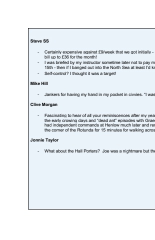 Steve SS- Certainly expensive against %u00a39/week that we got initially - bill up to %u00a336 for the month!- I was briefed by my instructor sometime later not to pay my15th - then if I banged out into the North Sea at least I%u2019d kn- Self-control? I thought it was a target!Mike Hill- Jankers for having my hand in my pocket in civvies. %u201cI wasClive Morgan- Fascinating to hear of all your reminiscences after my yearthe early crowing days and %u201cdead ant%u201d episodes with Graemhad independent commands at Henlow much later and remthe corner of the Rotunda for 15 minutes for walking acrosJonnie Taylor- What about the Hall Porters? Joe was a nightmare but the