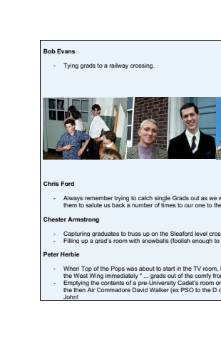 Bob Evans- Tying grads to a railway crossing.Chris Ford- Always remember trying to catch single Grads out as we wthem to salute us back a number of times to our one to theChester Armstrong- Capturing graduates to truss up on the Sleaford level cross- Filling up a grad%u2019s room with snowballs (foolish enough to Peter Herbie- When Top of the Pops was about to start in the TV room, bthe West Wing immediately \- Emptying the contents of a pre-University Cadet's room onthe then Air Commadore David Walker (ex PSO to the D oJohn!