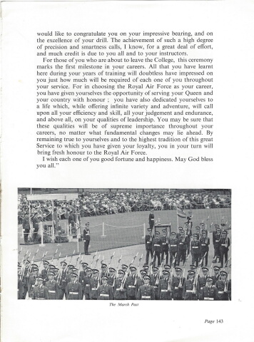 would like to congratulate you on your impressive bearing, and on the excellence of your drill. The achievement of such a high degree of precision and smartness calls, I know, for a great deal of effort, and much credit is due to you all and to your instructors. For those of you who are about to leave the College, this ceremony marks the first milestone in your careers. All that you have learnt here during your years of training will doubtless have impressed on you just how much will be required of each one of you throughout your service. For in choosing the Royal Air Force as your career, you have given yourselves the opportunity of serving your Queen and your country with honour ; you have also dedicated yourselves to a life which, while offering infinite variety and adventure, will call upon all your efficiency and skill, all your judgement and endurance, and above all, on your qualities of leadership. You may be sure that these qualities will be of supreme importance throughout your careers, no matter what fundamental changes may lie ahead. By remaining true to yourselves and to the highest tradition of this great Service to which you have given your loyalty, you in your turn will bring fresh honour to the Royal Air Force. I wish each one of you good fortune and happiness. May God bless you all.\The March Past Page 143