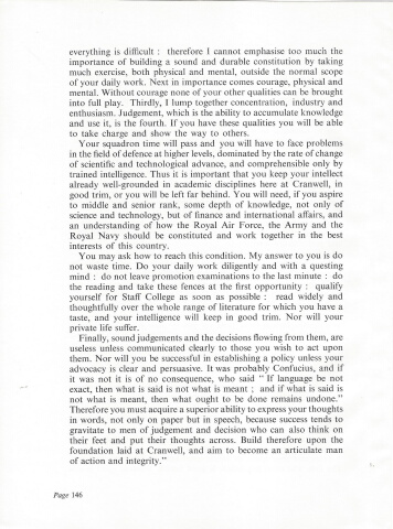 everything is difficult : therefore I cannot emphasise too much the importance of building a sound and durable constitution by taking much exercise, both physical and mental, outside the normal scope of your daily work. Next in importance comes courage, physical and mental. Without courage none of your other qualities can be brought into full play. Thirdly, T lump together concentration, industry and enthusiasm. Judgement, which is the ability to accumulate knowledge and use it, is the fourth. If you have these qualities you will be able to take charge and show the way to others. Your squadron time will pass and you will have to face problems in the field of defence at higher levels, dominated by the rate of change of scientific and technological advance, and comprehensible only by trained intelligence. Thus it is important that you keep your intellect already well-grounded in academic disciplines here at Cranwell, in good trim, or you will be left far behind. You will need, if you aspire to middle and senior rank, some depth of knowledge, not only of science and technology, but of finance and international affairs, and an understanding of how the Royal Air Force, the Army and the Royal Navy should be constituted and work together in the best interests of this country. You may ask how to reach this condition. My answer to you is do not waste time. Do your daily work diligently and with a questing mind : do not leave promotion examinations to the last minute : do the reading and take these fences at the first opportunity : qualify yourself for Staff College as soon as possible : read widely and thoughtfully over the whole range of literature for which you have a taste, and your intelligence will keep in good trim. Nor will your private life suffer. Finally, sound judgements and the decisions flowing from them, are useless unless communicated clearly to those you wish to act upon them. Nor will you be successful in establishing a policy unless your advocacy is clear and persuasive. It was probably Confucius, and if it was not it is of no consequence, who said \ language be not exact, then what is said is not what is meant ; and if what is said is not what is meant, then what ought to be done remains undone.\Therefore you must acquire a superior ability to express your thoughts in words, not only on paper but in speech, because success tends to gravitate to men of judgement and decision who can also think on their feet and put their thoughts across. Build therefore upon the foundation laid at Cranwell, and aim to become an articulate man of action and integrity.\Page 146