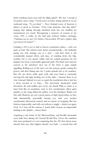 100birth certificate been sent with the flight plan?!) %u201cWe have 5 aircraft in the pattern, expect a delay.%u201d I look across at John, sitting tucked in on my starboard wing. %u201cI%u2019ve got plenty%u201d %u2013 New Zealand sense of humour is almost as good as German. %u201cOscar Lima formation, what time delay?%u201dhoping that talking through clenched teeth has not muffled my transmission too much. Recognising a measure of tension in my voice, ATC is really on the ball and, without further exchange, %u201cLufthansa you are now No3 behind a Messerschmitt 109 and a Spitfire, delay your turn for the localiser10.%u201dLanding a 109 is not as bad as history sometimes relates......well, not quite as bad. The wheels come down asymmetrically %u2013 the hydraulic pump can only manage one at a time %u2013 and then there is the considerable manual effort, and time, of winding down the flap.Luckily, she is very speed- stable, and my cockpit gyrations do not displace her from a reasonable approach path. The finals turn must be curved, as the tail-down view out of the front is quite simply appalling. Rolling out of the turn over the runway, gently cutting the power, and then flaring into the 3 point attitude has to be seamless.But she sits down really quite well, and your head is constantly moving left and right looking out of the sides %u2013 because there is no view forward. Indeed, it is not so much the touchdown that is fun but a short second or so later.... The previously mentioned small decorative fin and rudder, put on by our friend Willy to make it at least look like an aeroplane, start to lose aerodynamic effect quite quickly, as the wings blank the airflow over the tail-plane. Brakes (on this early Buchon) are not a good option at high speed either, as they fade dramatically, potentially leaving you with very modest aerodynamic directional control, and no means of stopping. But she behaves impeccably, and rolls out without a wiggle %u2013 thank you again, God. As I turn off the runway, I watch John execute an impeccable landing in the Spitfire %u2013 showy Kiwi!Augsburg is the home of the Messerschmitt, and literally thousands were built here during the Second World War. Given the numbers that were produced, it is not surprising that the 109 shot down more aircraft than any other fighter aircraft ever built %u2013 a record that will
