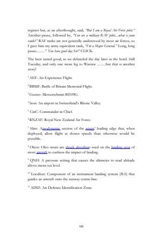 103register but, as an afterthought, said, %u201cBut I am a Royal Air Force pilot.%u201dAnother pause, followed by, %u201cYou are a military RAF pilot....what is your rank?%u201d RAF ranks are not generally understood by most air forces, so I gave him my army equivalent rank, %u201cI%u2019m a Major General.%u201d Long, long pause..........%u201d You have good day Sir!%u201d CLICK.The beer tasted good, as we debriefed the day later in the hotel. Still Tuesday, and only one more leg to Warsaw ..........but that is another story!1 AEF: Air Experience Flight.2 BBMF: Battle of Britain Memorial Flight.3 Gustav: Messerschmitt Bf109G.4 Sion: An airport in Switzerland%u2019s Rhone Valley.5 CinC: Commander in Chief.6 RNZAF: Royal New Zealand Air Force.7 Slats: Aerodynamic section of the wings%u2019 leading edge that, when deployed, allow flight at slower speeds than otherwise would be possible.8 Oleos: Oleo struts are shock absorbers used on the landing gear of most aircraft to cushion the impact of landing.9 QNH: A pressure setting that causes the altimeter to read altitude above mean sea level.10 Localiser: Component of an instrument landing system (ILS) that guides an aircraft onto the runway centre-line.11 ADIZ: Air Defence Identification Zone.