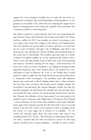 108engine has to be managed carefully but, in truth, the Sea Fury is a gentleman%u2019s aeroplane and, notwithstanding normal prudence on the ground, it is beautiful to fly. After take-off, reducing the engine boost back to cruising power and setting the propeller into automatic, the Centaurus settled to a reassuring purr.She really is quick for a prop aircraft, and I am soon negotiating the gap between Luton and Stansted and setting track direct for Calais.And joy, unlike the 109, I can actually see where I am going, as the nose slopes away from the cockpit to the massive five-bladed prop.The Fury quickly eats up the miles to Calais, and then it is a left turn up the coast of France, through a bit of Belgium, and then I am weaving my way through the various airfields and restricted areas to the south east of Amsterdam. The weather stays fine and, for a while, a Dutch F16 fighter saddles up on my starboard side before, with a cheery wave, the pilot breaks away in hard turn, with reheat glowing and massive streamers coming off the wings %u2013 fond memories! An hour and a half out from Cranfield, I am calling Groningen/Eelde approach frequency and, a few minutes later, I am cleared for a runand-break to land on Runway 05. I say to Air Traffic that I would prefer 01, which is right into the fresh wind, but am advised that there is temporary work in progress. No problem, and with judicious aileron into wind and a %u2018wheel%u2019 landing rather than a %u2018three pointer%u2019, the Sea Fury runs out down the runway pretty straight, despite the crosswind. I am greeted by the Airport Manager, Fokker (yes, like the aircraft company), an old friend who quickly gets the message that I am pushed for time, and he sets about getting fuel bowsers and the like. Despite the efficiency of my turn-round, I am now going to be pushed to get to Warsaw, and I flight-plan to Poznan in East Poland %u2013 with an alternate of one of the many airfields to the north of Berlin.Once again, the Centaurus growls into life and, with a wave to my old friend, I am off. The wind is now starting to blow a hooligan from the north, so I once again ask if runway 01 is available. %u2018No sir!%u2019 comes the cheerful reply, from the man warm and snug in his centrally-heated ATC Tower, %u201cThe work party are still painting white lines.%u201dAh well, a careful take-off with not-excessive power on this long runway should not be a major problem........should it? And it wasn%u2019t.