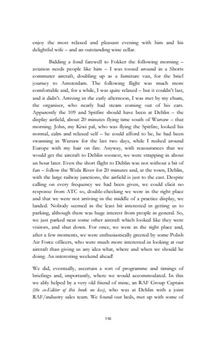 110enjoy the most relaxed and pleasant evening with him and his delightful wife %u2013 and an outstanding wine cellar.Bidding a fond farewell to Fokker the following morning %u2013aviation needs people like him %u2013 I was tossed around in a Shorts commuter aircraft, doubling up as a furniture van, for the brief journey to Amsterdam. The following flight was much more comfortable and, for a while, I was quite relaxed %u2013 but it couldn%u2019t last, and it didn%u2019t. Arriving in the early afternoon, I was met by my chum, the organiser, who nearly had steam coming out of his ears.Apparently the 109 and Spitfire should have been at Deblin %u2013 the display airfield, about 20 minutes flying time south of Warsaw %u2013 that morning. John, my Kiwi pal, who was flying the Spitfire, looked his normal, calm and relaxed self %u2013 he could afford to be, he had been swanning in Warsaw for the last two days, while I rushed around Europe with my hair on fire. Anyway, with reassurances that we would get the aircraft to Deblin soonest, we were strapping in about an hour later. Even the short flight to Deblin was not without a bit of fun %u2013 follow the Wisla River for 20 minutes and, at the town, Deblin, with the large railway junctions, the airfield is just to the east. Despite calling on every frequency we had been given, we could elicit no response from ATC so, double-checking we were in the right place and that we were not arriving in the middle of a practice display, we landed. Nobody seemed in the least bit interested in getting us to parking, although there was huge interest from people in general. So, we just parked near some other aircraft which looked like they were visitors, and shut down. For once, we were in the right place and, after a few moments, we were enthusiastically greeted by some Polish Air Force officers, who were much more interested in looking at our aircraft than giving us any idea what, where and when we should be doing. An interesting weekend ahead!We did, eventually, ascertain a sort of programme and timings of briefings and, importantly, where we would accommodated. In this we ably helped by a very old friend of mine, an RAF Group Captain (the co-Editor of this book no less), who was at Deblin with a joint RAF/industry sales team. We found our beds, met up with some of