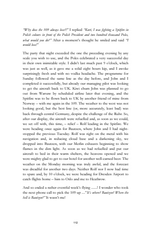 112%u201cWhy does the 109 always lose?!%u201d I replied %u201cKurt, I was fighting a Spitfire in Polish colours in front of the Polish President and two hundred thousand Poles, what would you do?%u201d After a moment%u2019s thought he smiled and said %u201cI would lose!%u201dThe party that night exceeded the one the preceding evening by any scale you wish to use, and the Poles celebrated a very successful day in their own inimitable style. I didn%u2019t last much past 9 o%u2019clock, which was just as well, as it gave me a solid eight hours kip, and I awoke surprisingly fresh and with no vodka headache. The programme for Sunday followed the same line as the day before, and John and I completed it successfully, but already our managing pilot was looking to get the aircraft back to UK. Kiwi chum John was planned to go out from Warsaw by scheduled airline later that evening, and the Spitfire was to be flown back to UK by another friend of mine from Norway %u2013 with me again in the 109. The weather to the west was not looking good, but the best line (or, more accurately, least bad) was back through central Germany, despite the challenge of the Ruhr. So, after our display, the aircraft were refuelled and, as soon as we could, we set off with, this time, %u2013 relief %u2013 Rolf leading in the Spitfire. We were heading once again for Bautzen, where John and I had nightstopped the previous Tuesday. Rolf was right on the metal with his navigation and, in reducing cloud base and a darkening sky, we dropped into Bautzen, with our Merlin exhausts beginning to show flames in the dim light. As soon as we had refuelled and put our aircraft to bed in their warm shelters, the heavens opened and we were mighty glad to get to our hotel for another well-earned beer. The weather on the Monday morning was truly awful, and the forecast was dreadful for another two days. Neither Rolf nor I now had time to spare and, by 10 o%u2019clock, we were heading for Dresden Airport to catch flights home %u2013 him to Oslo and me to Heathrow.And so ended a rather eventful week%u2019s flying .......! I wonder who took the next phone call to pick the 109 up ....%u201dIt%u2019s where? Bautzen? Where the hell is Bautzen?%u201d It wasn%u2019t me!