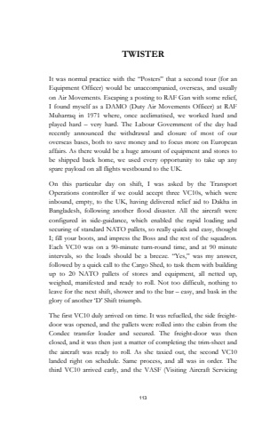 113TWISTERIt was normal practice with the %u201cPosters%u201d that a second tour (for an Equipment Officer) would be unaccompanied, overseas, and usually on Air Movements. Escaping a posting to RAF Gan with some relief, I found myself as a DAMO (Duty Air Movements Officer) at RAF Muharraq in 1971 where, once acclimatised, we worked hard and played hard %u2013 very hard. The Labour Government of the day had recently announced the withdrawal and closure of most of our overseas bases, both to save money and to focus more on European affairs. As there would be a huge amount of equipment and stores to be shipped back home, we used every opportunity to take up any spare payload on all flights westbound to the UK.On this particular day on shift, I was asked by the Transport Operations controller if we could accept three VC10s, which were inbound, empty, to the UK, having delivered relief aid to Dakha in Bangladesh, following another flood disaster. All the aircraft were configured in side-guidance, which enabled the rapid loading and securing of standard NATO pallets, so really quick and easy, thought I; fill your boots, and impress the Boss and the rest of the squadron.Each VC10 was on a 90-minute turn-round time, and at 90 minute intervals, so the loads should be a breeze. %u201cYes,%u201d was my answer, followed by a quick call to the Cargo Shed, to task them with building up to 20 NATO pallets of stores and equipment, all netted up, weighed, manifested and ready to roll. Not too difficult, nothing to leave for the next shift, shower and to the bar %u2013 easy, and bask in the glory of another %u2018D%u2019 Shift triumph.The first VC10 duly arrived on time. It was refuelled, the side freightdoor was opened, and the pallets were rolled into the cabin from the Condec transfer loader and secured. The freight-door was then closed, and it was then just a matter of completing the trim-sheet and the aircraft was ready to roll. As she taxied out, the second VC10 landed right on schedule. Same process, and all was in order. The third VC10 arrived early, and the VASF (Visiting Aircraft Servicing