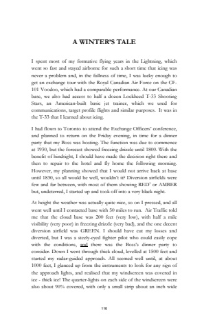 116A WINTER%u2019S TALEI spent most of my formative flying years in the Lightning, which went so fast and stayed airborne for such a short time that icing was never a problem and, in the fullness of time, I was lucky enough to get an exchange tour with the Royal Canadian Air Force on the CF101 Voodoo, which had a comparable performance. At our Canadian base, we also had access to half a dozen Lockheed T-33 Shooting Stars, an American-built basic jet trainer, which we used for communications, target profile flights and similar purposes. It was in the T-33 that I learned about icing.I had flown to Toronto to attend the Exchange Officers%u2019 conference, and planned to return on the Friday evening, in time for a dinner party that my Boss was hosting. The function was due to commence at 1930, but the forecast showed freezing drizzle until 1800. With the benefit of hindsight, I should have made the decision right there and then to repair to the hotel and fly home the following morning.However, my planning showed that I would not arrive back at base until 1830, so all would be well, wouldn%u2019t it? Diversion airfields were few and far between, with most of them showing RED1 or AMBER but, undeterred, I started up and took off into a very black night.At height the weather was actually quite nice, so on I pressed, and all went well until I contacted base with 50 miles to run. Air Traffic told me that the cloud base was 200 feet (very low), with half a mile visibility (very poor) in freezing drizzle (very bad), and the one decent diversion airfield was GREEN. I should have cut my losses and diverted, but I was a steely-eyed fighter pilot who could easily cope with the conditions, and there was the Boss%u2019s dinner party to consider. Down I went through thick cloud, levelled at 1500 feet and started my radar-guided approach. All seemed well until, at about 1000 feet, I glanced up from the instruments to look for any sign of the approach lights, and realised that my windscreen was covered in ice - thick ice! The quarter-lights on each side of the windscreen were also about 90% covered, with only a small strip about an inch wide
