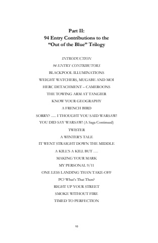 10Part II: 94 Entry Contributions to the%u201cOut of the Blue%u201d TrilogyINTRODUCTION94 ENTRY CONTRIBUTORSBLACKPOOL ILLUMINATIONSWEIGHT WATCHERS, MUGABE AND MOIHERC DETACHMENT %u2013 CAMEROONSTHE TOWING ARM AT TANGIERKNOW YOUR GEOGRAPHYA FRENCH BIRDSORRY? ...... I THOUGHT YOU SAID WARSAW!YOU DID SAY WARSAW! (A Saga Continued)TWISTERA WINTER%u2019S TALEIT WENT STRAIGHT DOWN THE MIDDLEA KILL%u2019S A KILL BUT %u2026.MAKING YOUR MARKMY PERSONAL 9/11ONE LESS LANDING THAN TAKE-OFFPC? What%u2019s That Then?RIGHT UP YOUR STREETSMOKE WITHOUT FIRETIMED TO PERFECTION