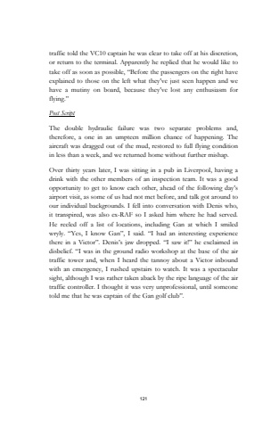 121traffic told the VC10 captain he was clear to take off at his discretion, or return to the terminal. Apparently he replied that he would like to take off as soon as possible, %u201cBefore the passengers on the right have explained to those on the left what they%u2019ve just seen happen and we have a mutiny on board, because they%u2019ve lost any enthusiasm for flying.%u201dPost ScriptThe double hydraulic failure was two separate problems and, therefore, a one in an umpteen million chance of happening. The aircraft was dragged out of the mud, restored to full flying condition in less than a week, and we returned home without further mishap.Over thirty years later, I was sitting in a pub in Liverpool, having a drink with the other members of an inspection team. It was a good opportunity to get to know each other, ahead of the following day%u2019s airport visit, as some of us had not met before, and talk got around to our individual backgrounds. I fell into conversation with Denis who, it transpired, was also ex-RAF so I asked him where he had served.He reeled off a list of locations, including Gan at which I smiled wryly. %u201cYes, I know Gan%u201d, I said. %u201cI had an interesting experience there in a Victor%u201d. Denis%u2019s jaw dropped. %u201cI saw it!%u201d he exclaimed in disbelief. %u201cI was in the ground radio workshop at the base of the air traffic tower and, when I heard the tannoy about a Victor inbound with an emergency, I rushed upstairs to watch. It was a spectacular sight, although I was rather taken aback by the ripe language of the air traffic controller. I thought it was very unprofessional, until someone told me that he was captain of the Gan golf club%u201d.