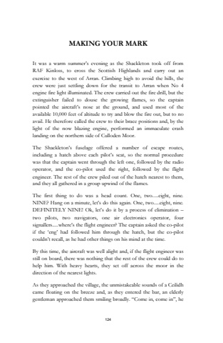 124MAKING YOUR MARKIt was a warm summer%u2019s evening as the Shackleton took off from RAF Kinloss, to cross the Scottish Highlands and carry out an exercise to the west of Arran. Climbing high to avoid the hills, the crew were just settling down for the transit to Arran when No 4 engine fire light illuminated. The crew carried out the fire drill, but the extinguisher failed to douse the growing flames, so the captain pointed the aircraft%u2019s nose at the ground, and used most of the available 10,000 feet of altitude to try and blow the fire out, but to no avail. He therefore called the crew to their brace positions and, by the light of the now blazing engine, performed an immaculate crash landing on the northern side of Culloden Moor. The Shackleton%u2019s fuselage offered a number of escape routes, including a hatch above each pilot%u2019s seat, so the normal procedure was that the captain went through the left one, followed by the radio operator, and the co-pilot used the right, followed by the flight engineer. The rest of the crew piled out of the hatch nearest to them, and they all gathered in a group upwind of the flames.The first thing to do was a head count. One, two.....eight, nine.NINE? Hang on a minute, let%u2019s do this again. One, two.....eight, nine.DEFINITELY NINE! Ok, let%u2019s do it by a process of elimination %u2013two pilots, two navigators, one air electronics operator, four signallers.....where%u2019s the flight engineer? The captain asked the co-pilot if the %u2018eng%u2019 had followed him through the hatch, but the co-pilot couldn%u2019t recall, as he had other things on his mind at the time. By this time, the aircraft was well alight and, if the flight engineer was still on board, there was nothing that the rest of the crew could do to help him. With heavy hearts, they set off across the moor in the direction of the nearest lights.As they approached the village, the unmistakeable sounds of a Ceilidh came floating on the breeze and, as they entered the bar, an elderly gentleman approached them smiling broadly. %u201cCome in, come in%u201d, he
