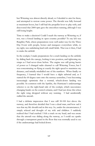 127but Wittering was almost directly ahead, so I decided to aim for there, and attempted to restore some power. The throttle was fully forward at maximum boost, but I still had the propeller lever to play with, and discovered that 2400 rpm gave the smoothest running, although I was still losing height.Time to make a decision! Could I reach the runway at Wittering or, if not, was a forced landing in open country possible? To my left was Burghley Park, where preparations were well under way for the Three Day Event with people, horses and marquees everywhere while, to my right, was undulating land with small fields. That was it then, I had to make the airfield.In the cockpit, I made preparations for a crash landing on the airfield, by sliding back the canopy, locking it into position, and tightening my straps as I had never done before. The engine was still giving bursts of power as I changed radio channel to call Wittering Tower, but I was concentrating on flying at exactly the right speed to maximize my distance, and initially misdialled one of the numbers. When finally on frequency, I learned that I would have a slight tailwind and, as I started the 60 degree turn onto the runway centreline, I was becoming increasingly optimistic that a normal, wheels-down landing was possible. In common with the Spitfire, the Hurricane%u2019s undercarriage selector is on the right-hand side of the cockpit, which necessitates changing hands on the control column, and I had just done this when the right wing dropped without any warning. I had accidentally stalled the aircraft.I had a definite impression that I was still 50-100 feet above the runway, and therefore decided that I was a dead man, and how sad it was that my life should end in this way. So, under the circumstances, I simply relaxed and thought of my wife and children. I suddenly realised that I had crashed. I felt a crack on my head, and was aware that the aircraft was sliding along the runway, as I could see sparks through a transparent panel in the floor that was normally used to see if the undercarriage had locked down.