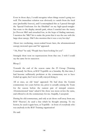 136Even in those days, I could recognise when things weren%u2019t going too well. The immediate solution was obviously to vanish from the local area (preferably forever), and I contemplated this as I passed through the %u2018Special Enclosure for the Disabled%u2019 on my high-speed-straightline route to the display aircraft park, where I crawled into the trusty Jet Provost Mk5 and crouched low, in the hope of finding sanctuary. I mention the %u2018Mk5%u2019 bit to make the point that it was the one with the large clear canopy. Did I also mention that it was a very hot day?About two sweltering, sweat-soaked hours later, the aforementioned canopy motored open and %u2018Sir%u2019 appeared.%u201cAh, Peter%u201d he said, %u201cPeople have been looking for you%u201d.Strangely there were no repercussions from that one. I wish I could say the same for its successor.Bloop 2Towards the end of the season came the 23 Group (Training Command) Air Show, at RAF Topcliffe on a Saturday. By that time, I had become sufficiently proficient at the commentary not to have fouled up again, but I never really enjoyed doing it.All at once, an old %u2018mate%u2019 appeared. He had done the Gemini commentary two years before me, prior to actually joining the Team for the season before the current pair of intrepid aviators.Aforementioned %u2018mate%u2019 asked if the show was more-or-less the same, and offered to do the commentary for me. Stupidly, I accepted.During his old commentary, and only at air shows well away from any RAF %u2018Heavies%u2019, he used a line which he thought amusing. To my horror, he used it again here, at Topcliffe - in front of everybody who was anybody in the RAF Training organisation!He said: