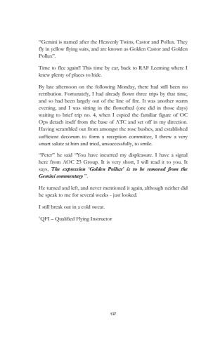 137%u201cGemini is named after the Heavenly Twins, Castor and Pollux. They fly in yellow flying suits, and are known as Golden Castor and Golden Pollux%u201d.Time to flee again!! This time by car, back to RAF Leeming where I knew plenty of places to hide.By late afternoon on the following Monday, there had still been no retribution. Fortunately, I had already flown three trips by that time, and so had been largely out of the line of fire. It was another warm evening, and I was sitting in the flowerbed (one did in those days) waiting to brief trip no. 4, when I espied the familiar figure of OC Ops detach itself from the base of ATC and set off in my direction. Having scrambled out from amongst the rose bushes, and established sufficient decorum to form a reception committee, I threw a very smart salute at him and tried, unsuccessfully, to smile.%u201cPeter%u201d he said %u201cYou have incurred my displeasure. I have a signal here from AOC 23 Group. It is very short, I will read it to you. It says, The expression %u2018Golden Pollux%u2019 is to be removed from the Gemini commentary %u201d.He turned and left, and never mentioned it again, although neither did he speak to me for several weeks - just looked.I still break out in a cold sweat.1QFI %u2013 Qualified Flying Instructor