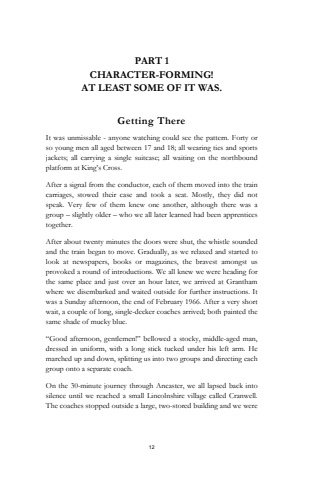 12PART 1 CHARACTER-FORMING! AT LEAST SOME OF IT WAS.Getting ThereIt was unmissable - anyone watching could see the pattern. Forty or so young men all aged between 17 and 18; all wearing ties and sports jackets; all carrying a single suitcase; all waiting on the northbound platform at King%u2019s Cross. After a signal from the conductor, each of them moved into the train carriages, stowed their case and took a seat. Mostly, they did not speak. Very few of them knew one another, although there was a group %u2013 slightly older %u2013 who we all later learned had been apprentices together. After about twenty minutes the doors were shut, the whistle sounded and the train began to move. Gradually, as we relaxed and started to look at newspapers, books or magazines, the bravest amongst us provoked a round of introductions. We all knew we were heading for the same place and just over an hour later, we arrived at Grantham where we disembarked and waited outside for further instructions. It was a Sunday afternoon, the end of February 1966. After a very short wait, a couple of long, single-decker coaches arrived; both painted the same shade of mucky blue. %u201cGood afternoon, gentlemen!%u201d bellowed a stocky, middle-aged man, dressed in uniform, with a long stick tucked under his left arm. He marched up and down, splitting us into two groups and directing each group onto a separate coach.On the 30-minute journey through Ancaster, we all lapsed back into silence until we reached a small Lincolnshire village called Cranwell. The coaches stopped outside a large, two-stored building and we were