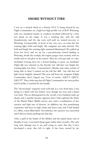 140SMOKE WITHOUT FIREI was on a tactical check in a Hunter FGA 9, being chased by my Flight Commander on a high-low-high profile out of RAF Wittering, with two simulated attacks in southern Scotland followed by a first run attack on the range. It was a cracking day, with the odd thunderstorm, and the trip went well until we started recovery to Wittering. Unexpectedly, in front of my very eyes, on came the fire warning light, bold and bright. My wingman was duly advised. The bold and bright fire warning light remained illuminated. We pulled up from low level, and set up for a precautionary forced landing at Wittering. Inside the cockpit, the engine gauges were normal, with no smells and no red glow in the mirror. Must be a hot gas leak or a fire, methinks! Getting close for a forced landing, so press on, methinks!Flight idle was selected on the throttle, but still that very bright fire warning light was there. I transmitted a Mayday and, when certain of being able to land, I carried out the full fire drill - but still that red light shone brightly, dammit! The next call from my wingman (Flight Commander, don%u2019t forget!) was %u201cLots of smoke %u2013EJECT, EJECT, EJECT!!%u201d Thus, believing that all Flight Commanders are near perfect and God-like, I reached for the handle.The %u201cboom-bang%u201d sequence went well and, in a very short time, I was laying in a ditch with the helmet visor though my nose and a damn sore back. The jet disintegrated in the woods a few hundred yards up ahead, and it quickly became apparent that I had explored the limits of the Martin Baker Mk4H ejector seat, with a combination of late ejection and high rate of descent. In addition, my first parachuting experience had been in high winds and heavy rain, and I had landed in a filthy, water-filled ditch. Nevertheless, the ejection was successful and I did not break anything else that day.After a spell in the hands of the Medics and the spinal injury unit at Headley Court, I was back flying again within three months. The only long term damage was to my golf swing as, since that day, I have developed a nasty slice left to right. It has been caused by my