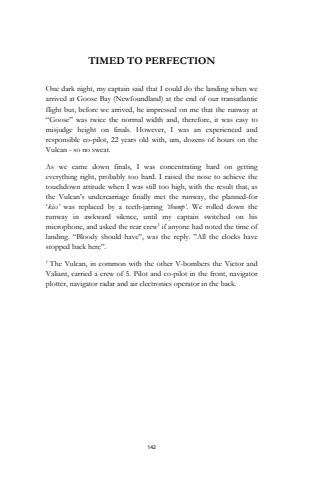 142TIMED TO PERFECTIONOne dark night, my captain said that I could do the landing when we arrived at Goose Bay (Newfoundland) at the end of our transatlantic flight but, before we arrived, he impressed on me that the runway at %u201cGoose%u201d was twice the normal width and, therefore, it was easy to misjudge height on finals. However, I was an experienced and responsible co-pilot, 22 years old with, um, dozens of hours on the Vulcan - so no sweat.As we came down finals, I was concentrating hard on getting everything right, probably too hard. I raised the nose to achieve the touchdown attitude when I was still too high, with the result that, as the Vulcan%u2019s undercarriage finally met the runway, the planned-for %u2018kiss%u2019 was replaced by a teeth-jarring %u2018thump%u2019. We rolled down the runway in awkward silence, until my captain switched on his microphone, and asked the rear crew1 if anyone had noted the time of landing. %u201cBloody should have%u201d, was the reply. %u201dAll the clocks have stopped back here%u201d.1 The Vulcan, in common with the other V-bombers the Victor and Valiant, carried a crew of 5. Pilot and co-pilot in the front, navigator plotter, navigator radar and air electronics operator in the back.