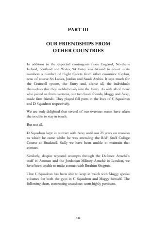 143PART IIIOUR FRIENDSHIPS FROM OTHER COUNTRIESIn addition to the expected contingents from England, Northern Ireland, Scotland and Wales, 94 Entry was blessed to count in its numbers a number of Flight Cadets from other countries: Ceylon, now of course Sri Lanka, Jordan and Saudi Arabia. It says much for the Cranwell system, the Entry and, above all, the individuals themselves that they melded easily into the Entry. As with all of those who joined us from overseas, our two Saudi friends, Muggy and Azzy, made firm friends. They played full parts in the lives of C Squadron and D Squadron respectively.We are truly delighted that several of our overseas mates have taken the trouble to stay in touch. But not all.D Squadron kept in contact with Azzy until our 25 years on reunionto which he came whilst he was attending the RAF Staff College Course at Bracknell. Sadly we have been unable to maintain that contact. Similarly, despite repeated attempts through the Defence Attach%u00e9%u2019s staff in Amman and the Jordanian Military Attach%u00e9 in London, we have been unable to make contact with Ibrahim Shogran.That C Squadron has been able to keep in touch with Muggy speaks volumes for both the guys in C Squadron and Muggy himself. The following short, contrasting anecdotes seem highly pertinent.